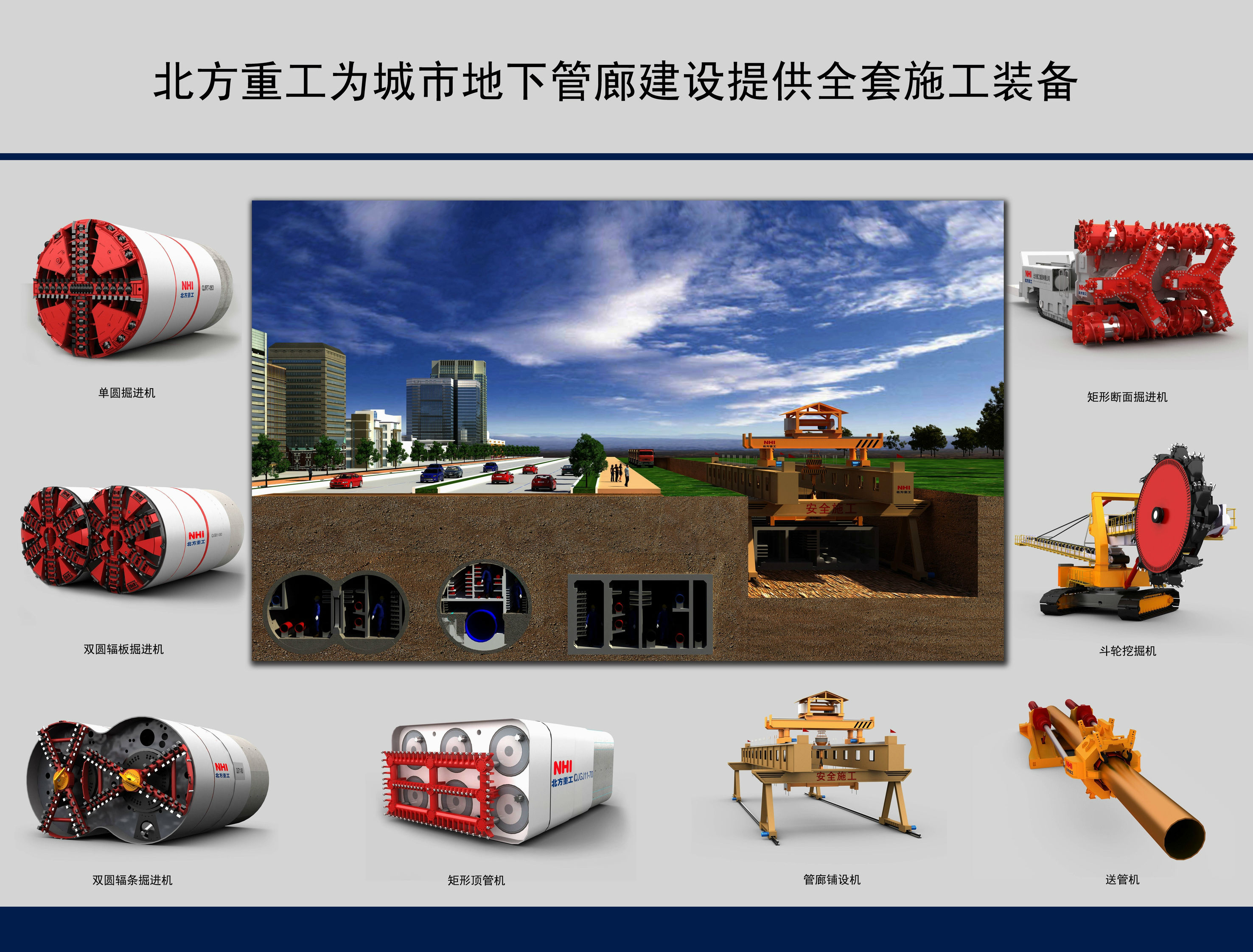 北方重工擁有全套管廊建設施工裝備解決方案,技術全面,設備精良。明挖設備有矩形斷面掘進機和斗輪挖掘機。暗挖設備有單圓掘進機、雙圓掘進機和矩形頂管機。明挖輔助設備有送管機和管廊鋪設機等。